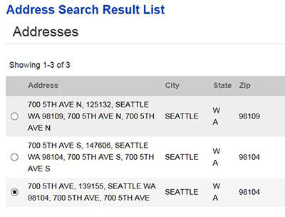 - If the search has multiple results, you should see a page like the one below. Click on the Selection Bubble of the correct property address and then click the Select button.