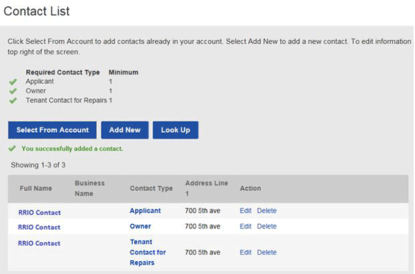 You must enter 3 contact types: Owner, Applicant, and Tenant Contact for Repairs. These can be the same person but must be entered separately. You will not be able to continue your application without entering all 3 contact types.