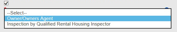 Declare that your property meets the RRIO standards by checking the box and selecting Owner/Owner’s Agent or Inspection by Qualified Rental Housing Inspector from the dropdown menu