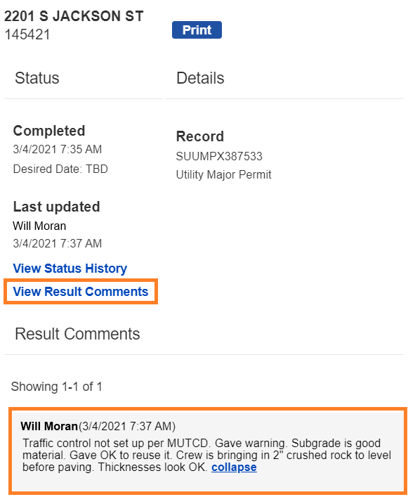 Result Comments: Click on the View Result Comments link to see comments from your inspector specific to this inspection. This comment is also sent by email to all record contacts when the inspection status is set. The comment is also included in the Inspections Results report available on the Attachments tab of your permit.