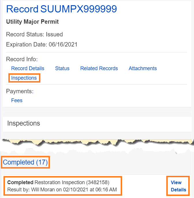 View Status History: Click on the link to see the history for the inspection, such as when it was scheduled and completed.