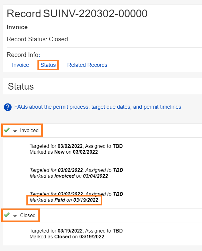 If your permit fees are billed, an invoice is generated at the beginning of each month for fees from the prior month. The invoice is stored on a special invoice record, not on your permit record. Fees are still paid on your permit record. To find your invoice, please refer to our help article for step-by-step instructions: How to Find and Pay Your Current Street Use Invoice.