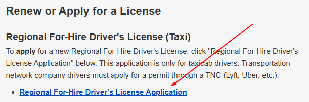 - Under the Renew or Apply for a License select Regional For-Hire Driver's License Application.