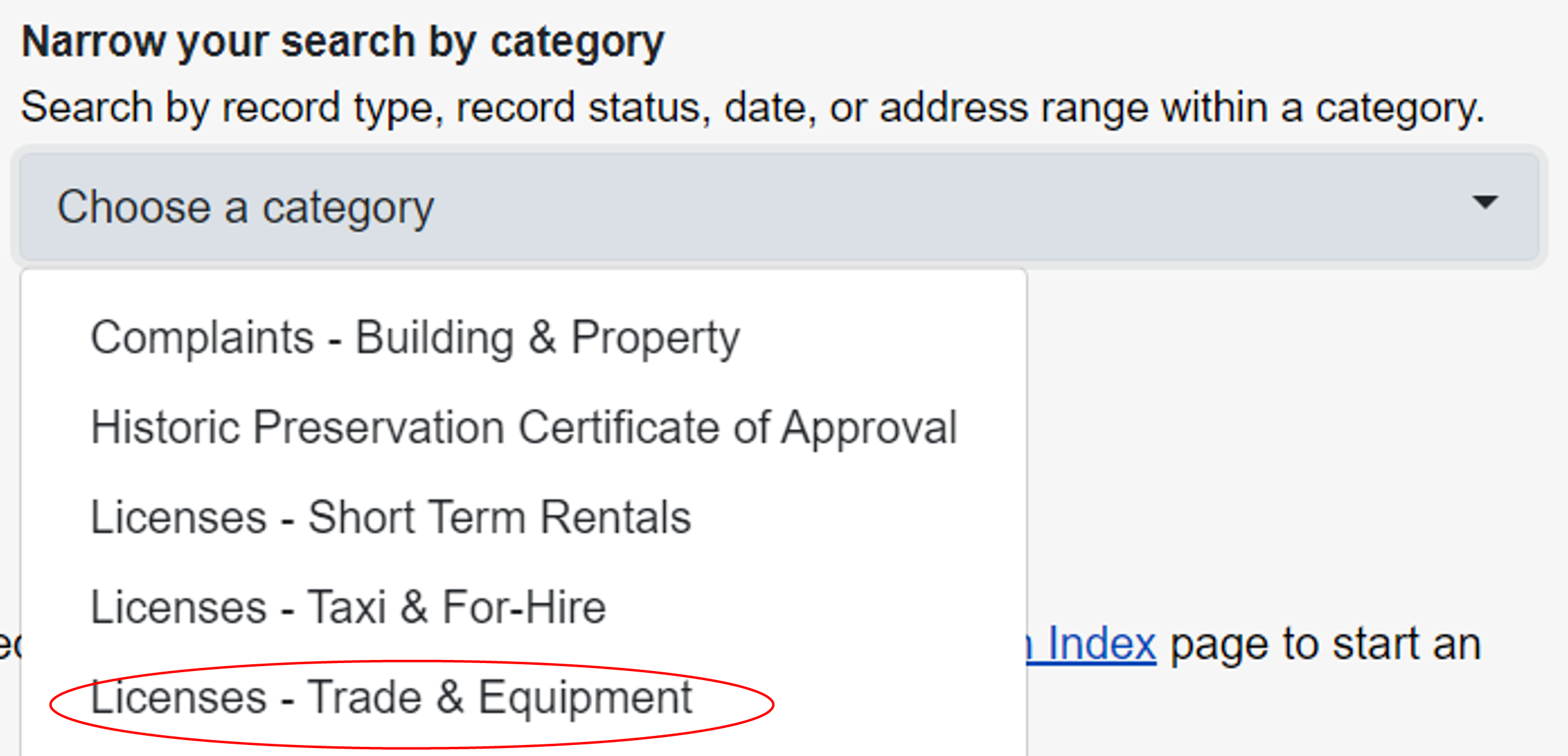 - Under Find Existing, choose Licenses – Trade & Equipment from the dropdown under “Narrow your search by category"