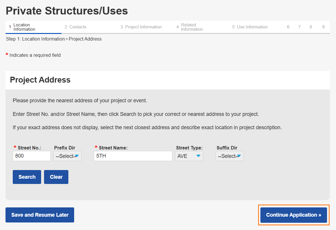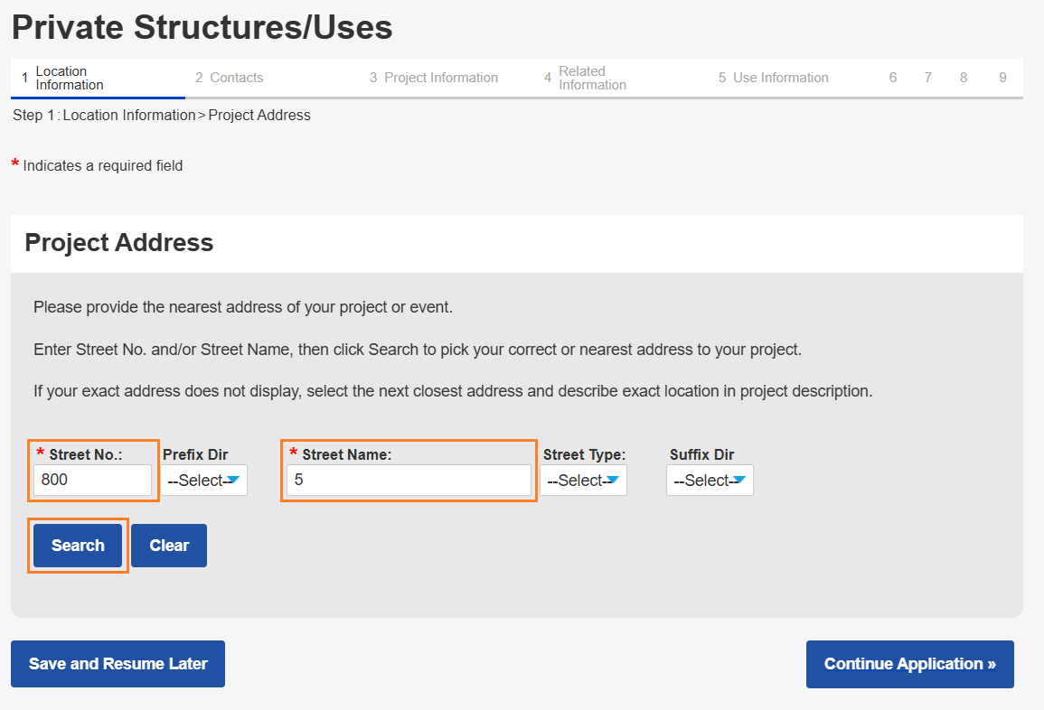 - On the Location Information page, enter your project address. For best results, only enter the Street No. and Street Name when searching.