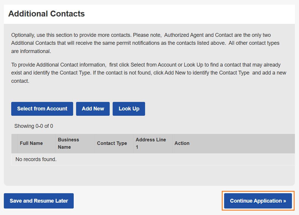 - Optionally, add additional contacts like an Authorized Agent in the Additional Contacts section.