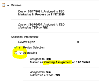 - Click the small Carrot next to the hourglass by each review to expand it (the hourglass indicates this is an active review)