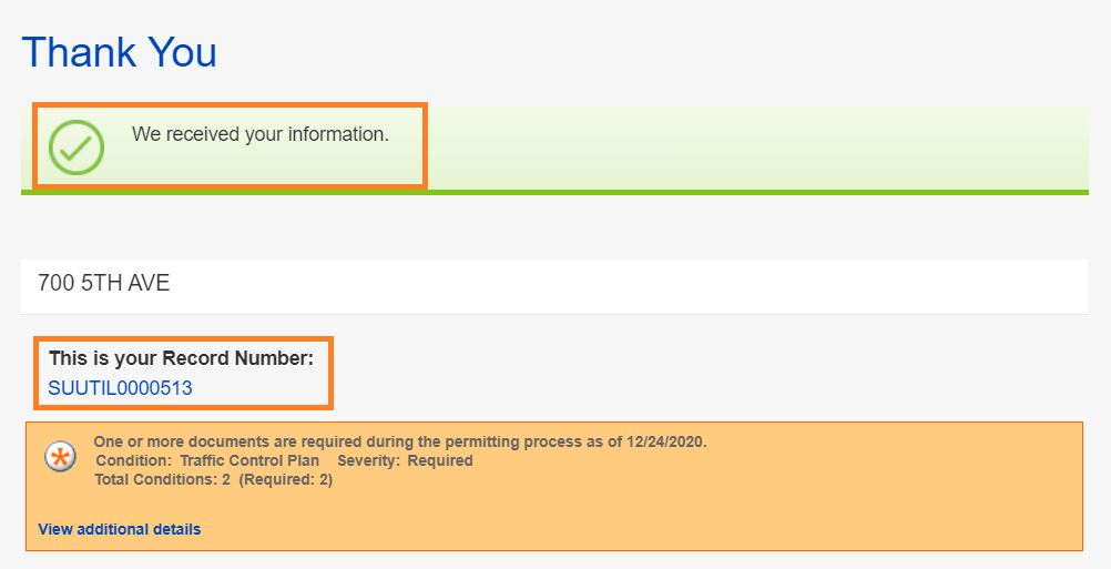 Congratulations! Your application has been submitted for review. The Street Use team will contact you if additional information is required. For questions or updates, email SDOTPermits@seattle.gov and include your Record Number in the subject line.