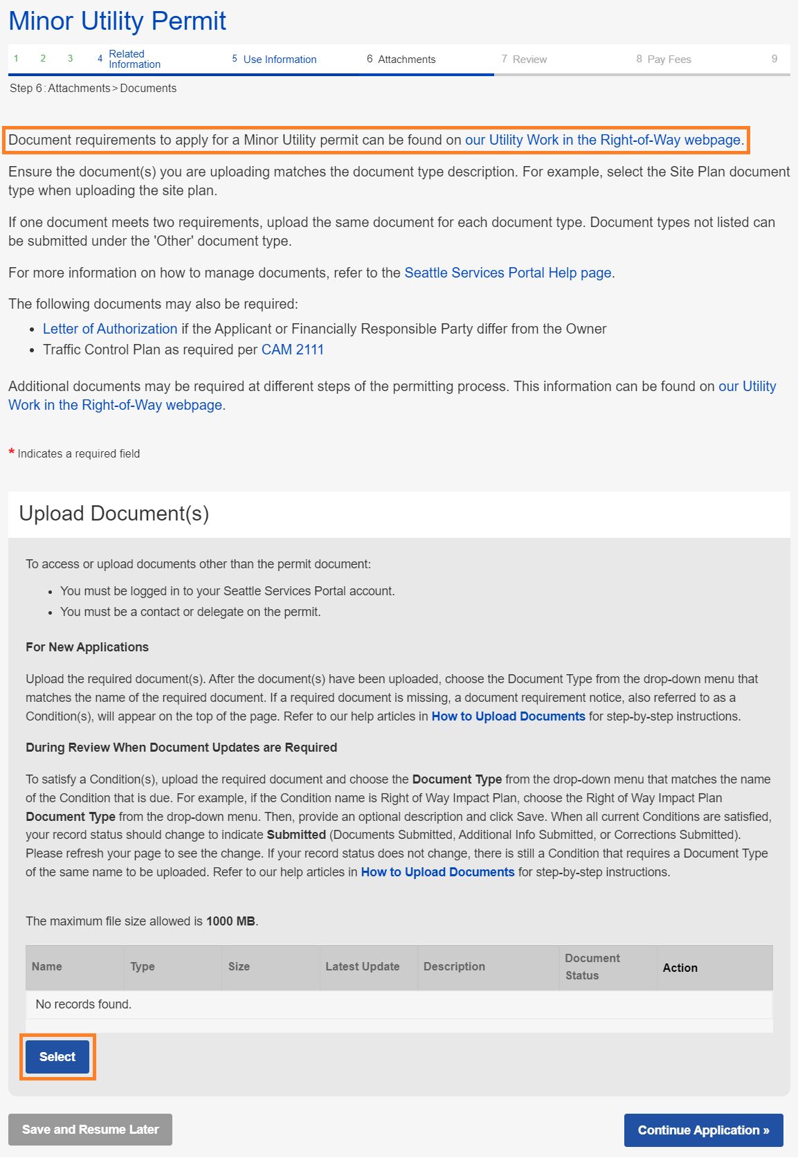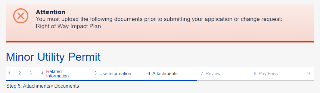 On the Documents page, some required documents are listed. Document requirements vary based on the ROW usages on your application. Some documents are required at application, and some are required later during the review process.