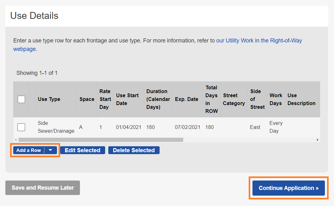 - The pop-up form closes, and you are returned to the Use Details section. The ROW usage information you just added is visible.