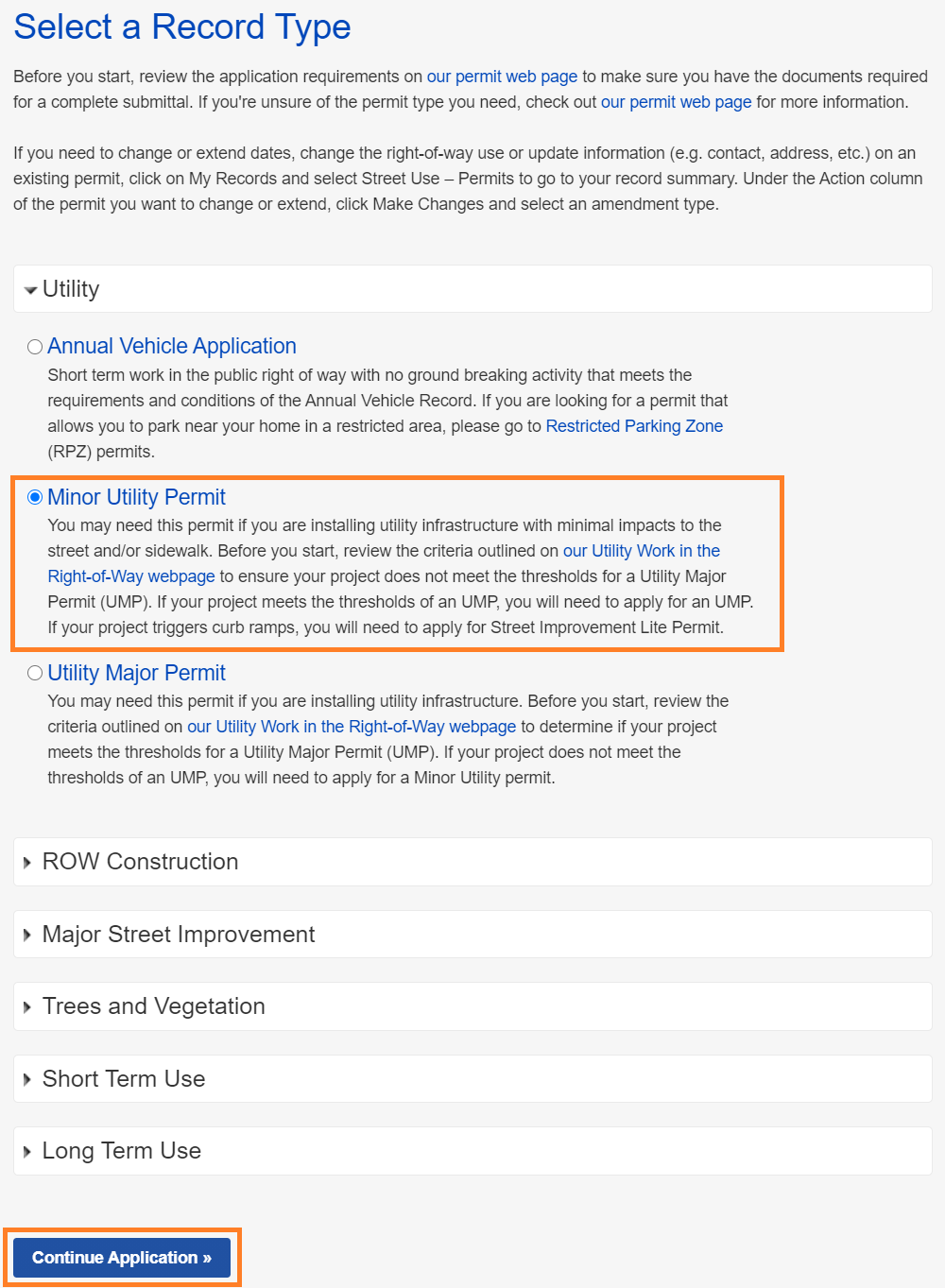 - Other ROW Impact (required): Alley, gravel shoulder, planting strip, and the like. Defaults to "No." If your work will block other right-of-way, select "Yes."
