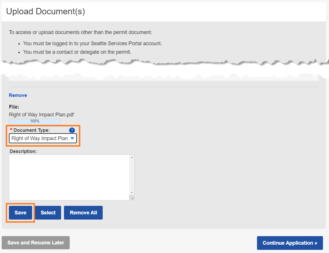 - In the Document Type dropdown, select the document type that matches the document you uploaded. For example, select "Right of Way Impact Plan" as your document type when uploading the matching document.