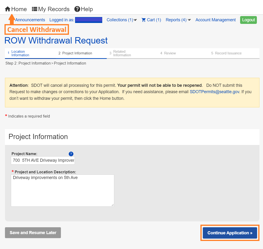 Follow these steps to request a withdrawal of your unissued Street Use application or amendment using the Seattle Services Portal. Withdrawal requests use a Right-of-Way (ROW) Withdrawal Request.