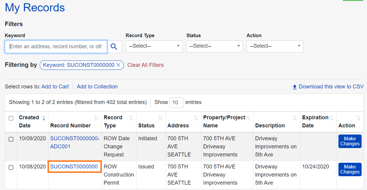 - Click the blue linked Record Number of your permit to open it. Note that you do NOT need to click Make Changes.
