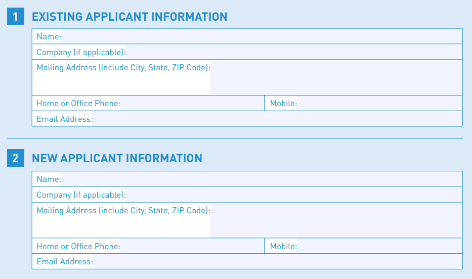 - For each existing contact to be removed, fill out the existing contact's name or company, address, phone, and email address in the Existing...Information section for the role where the contact is changing.