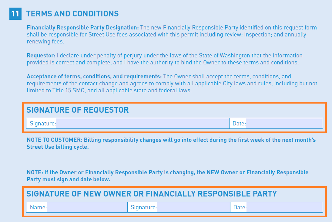 - If the Owner or Financially Responsible Party are changing, the new Owner or Financially Responsible Party must accept the Terms and Conditions by signing and dating the form in the Signature of New Owner or Financially Responsible Party section.
